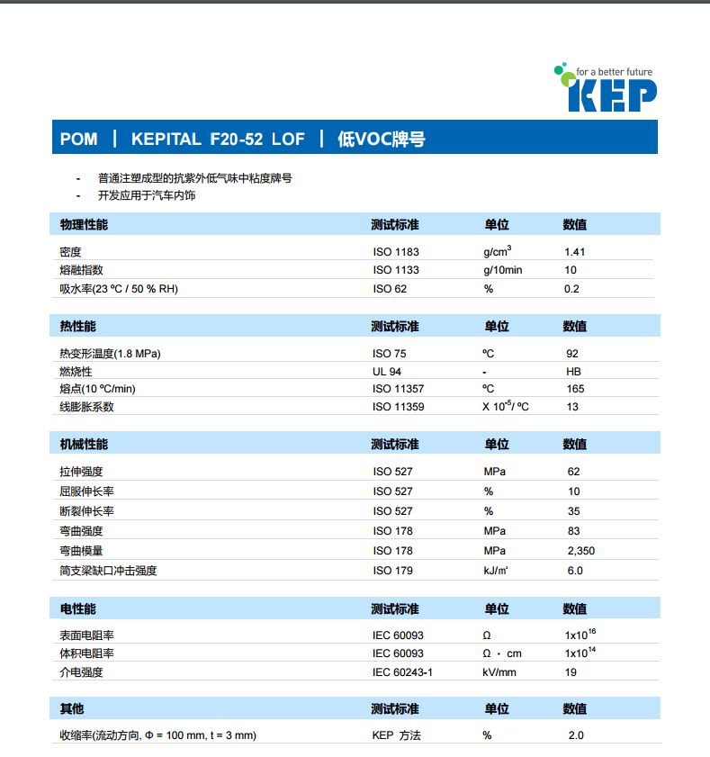 KEPITAL POM F20-52 LOF 普通注塑成型的抗紫外低气味中粘度