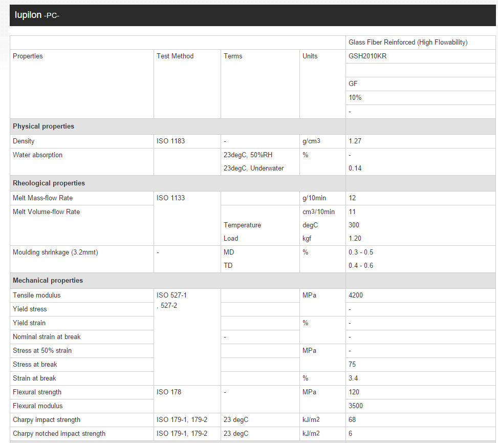 Iupilon PC GSH2010KR 高流动 10%玻纤增强 注塑级