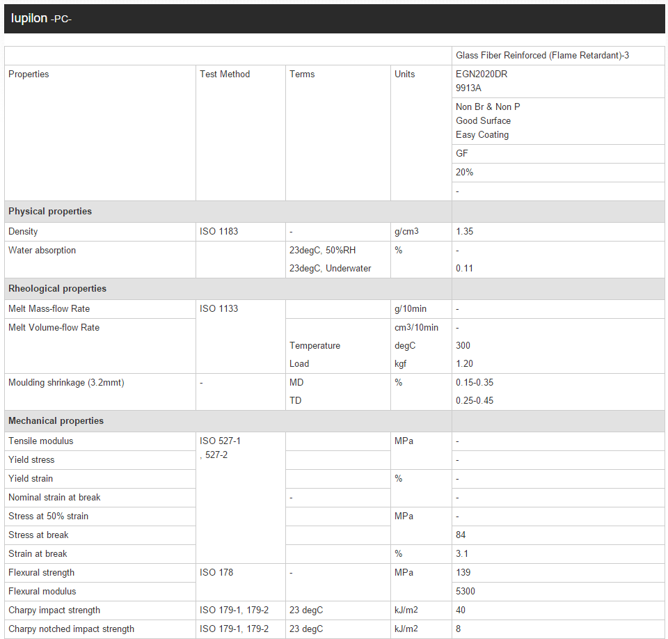 Iupilon PC EGN2020DR 9913A 高流动 无卤阻燃 相机专用 20%玻纤增强 注塑级
