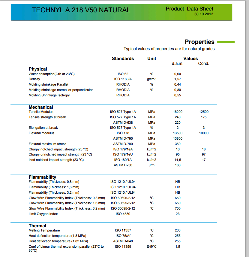产品系列:高硬度材料聚酰胺66年,钢筋和玻璃纤维的50%,热稳定,注塑。 TECHNYL 218 V50 用于所有部门的行业,提供一个很好的结合热、变薄拉伸过程