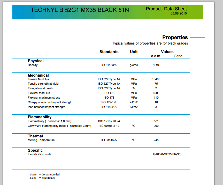 产品系列:无卤素FR与热防护性能共聚酰胺6.6/6,灼热丝阻力和矿物填充。 TECHNYL B 52 G1 MX35 提供线发光性能优异,热好,尺寸稳定性