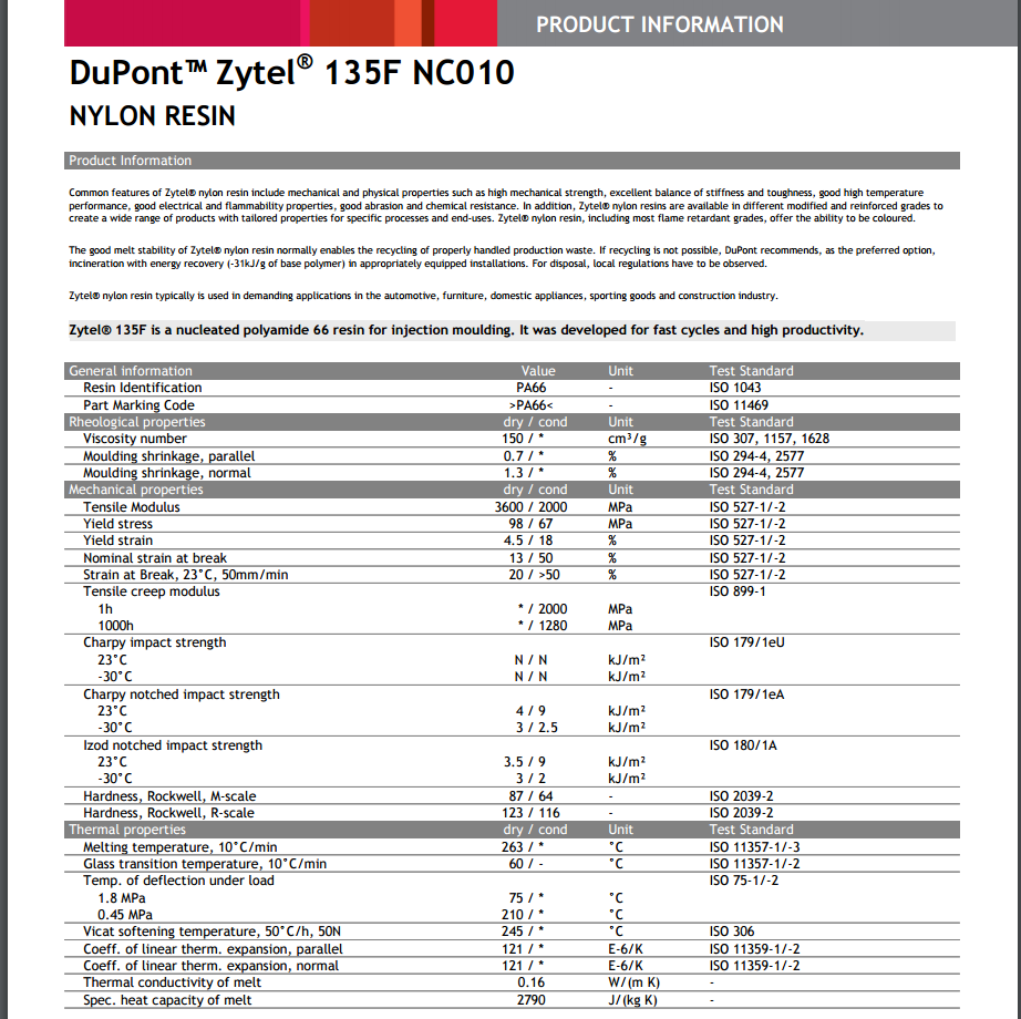 Zytel PA66 135F NC010 未增强,成核化,尼龙66