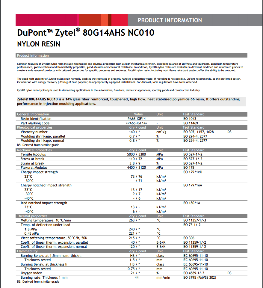 Zytel PA66 80G14AHS NC010/BK099 14% 玻纤增强, 增韧, 热稳定, 尼龙66