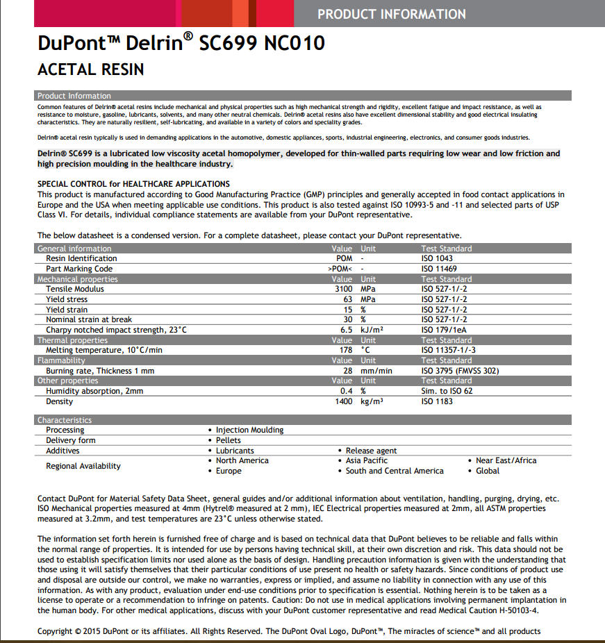 Delrin POM SC699 NC010 有机硅润滑 低粘度均聚甲醛具有低磨耗和低摩擦性能用于医疗行业