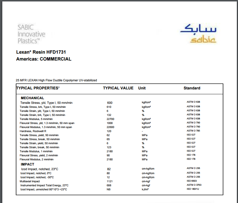 LEXAN PC HFD1731 25 MFR Lexan高流量韧性共聚物 抗UV