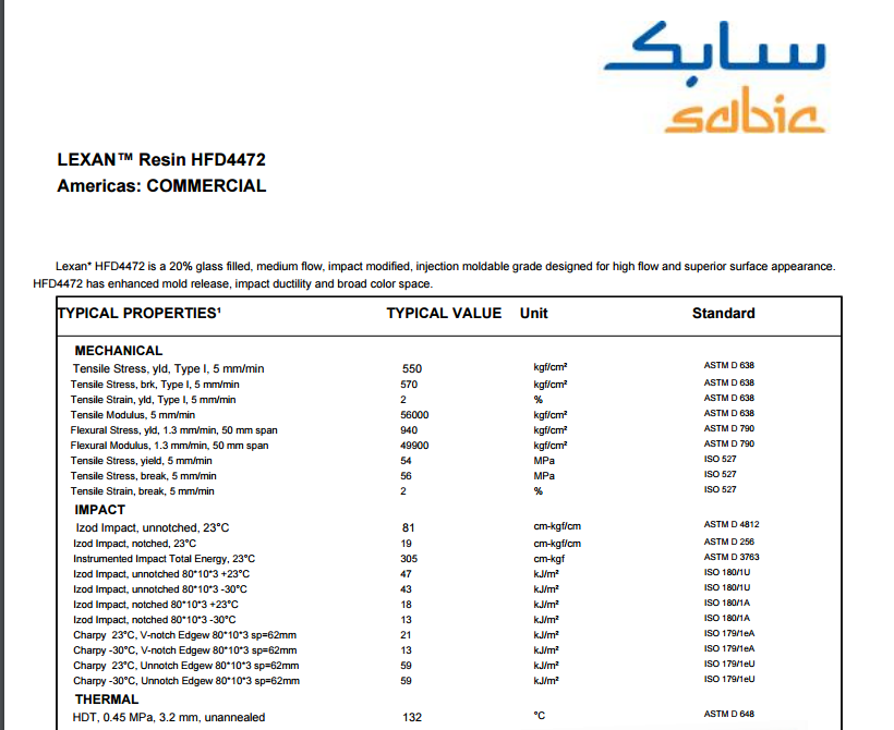 LEXAN PC HFD4472 20%玻璃填充,冲击改性,注射模压级设计的高流量和良好的表面外观。