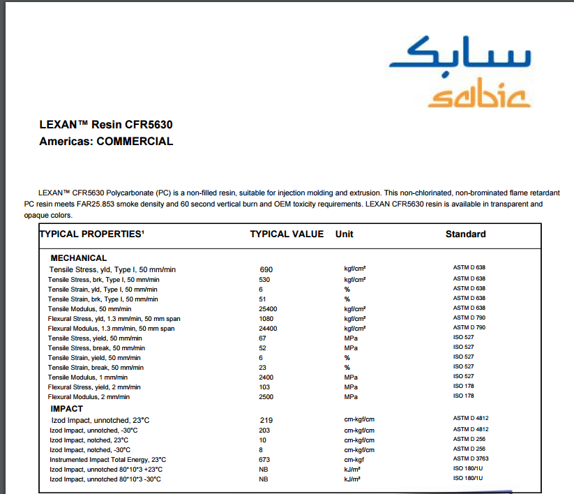 LEXAN PC CFR5630 一种非填充树脂,适用于注塑和挤出。这无氯、无溴化阻燃剂