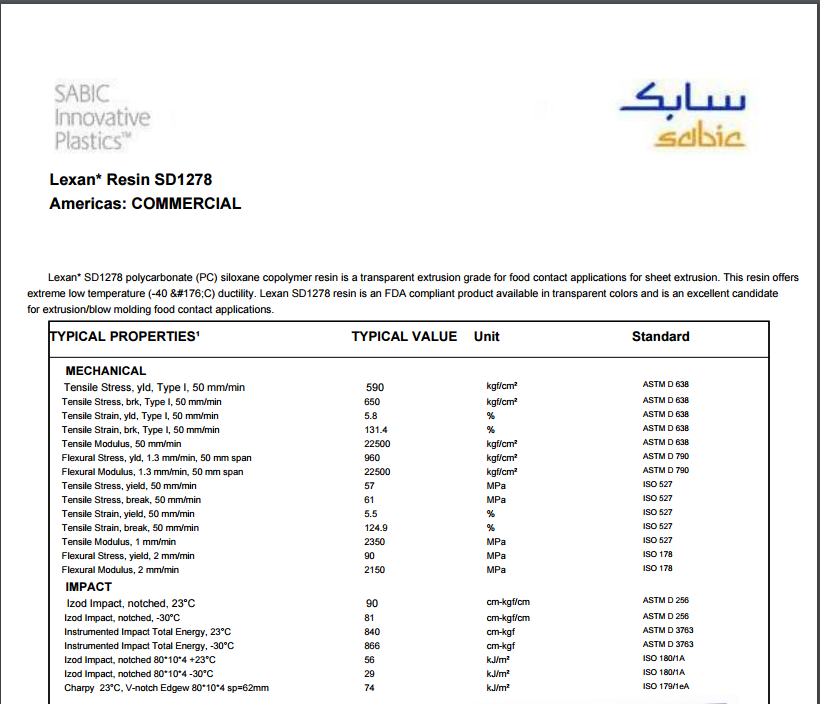 LEXAN PC SD1278 硅氧烷共聚物树脂用于食品接触应用透明片材挤出级