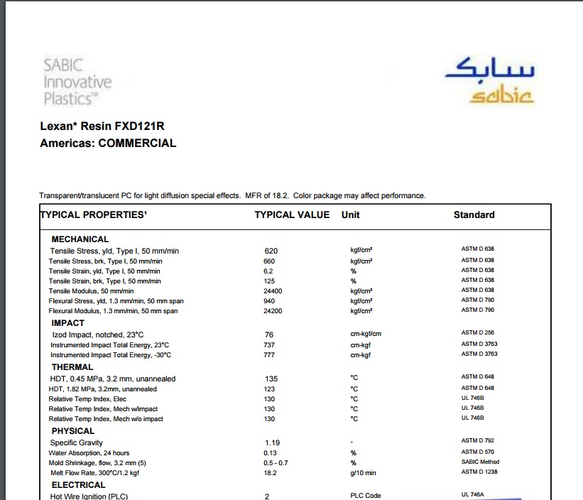 LEXAN PC FXD121R 光扩散级 MFR 18.2。颜色可能会影响性能