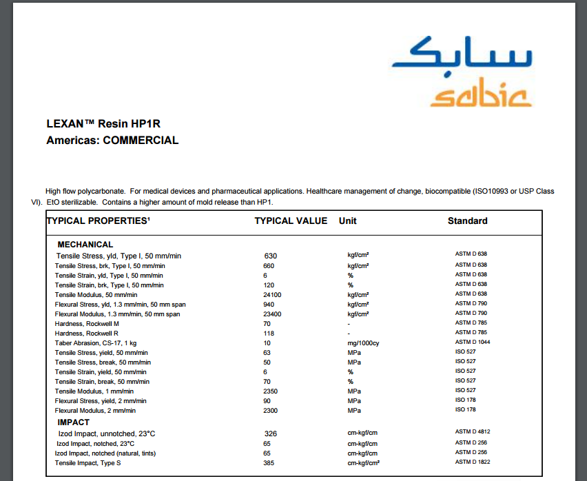 LEXAN PC HP1R 医疗、保健相关用途。黏度、颜色、掺杂物可控。符合FDA tripartite (ISO 10993-1 修订版)/USP Class VI规范。 外用脱模剂。