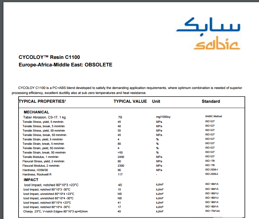 CYCOLOY PC/ABS C1100 通用。PC/ABS合金聚化物