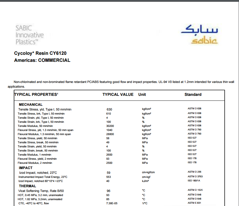 Cycoloy PC/ABS CY6120 非溴化、非氯化阻燃PC/ABS。