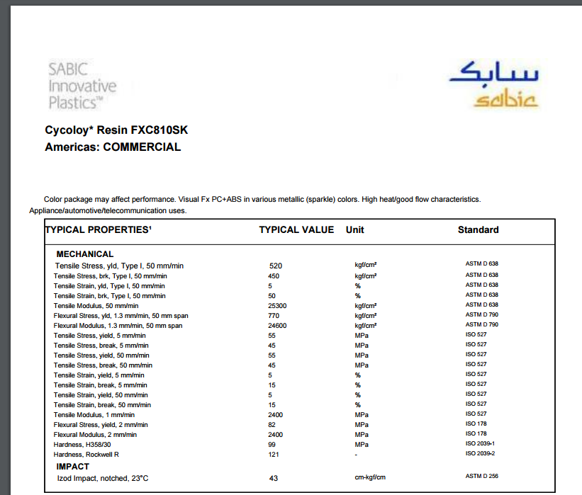 Cycoloy PC/ABS FXC810SK 非溴化、非氯化阻燃PC/ABS。