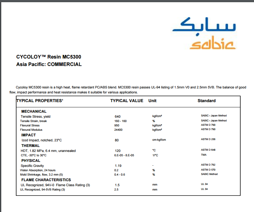 Cycoloy PC/ABS MC1300 汽车用。优异的流动性和抗冲击性能。 电镀应用。
