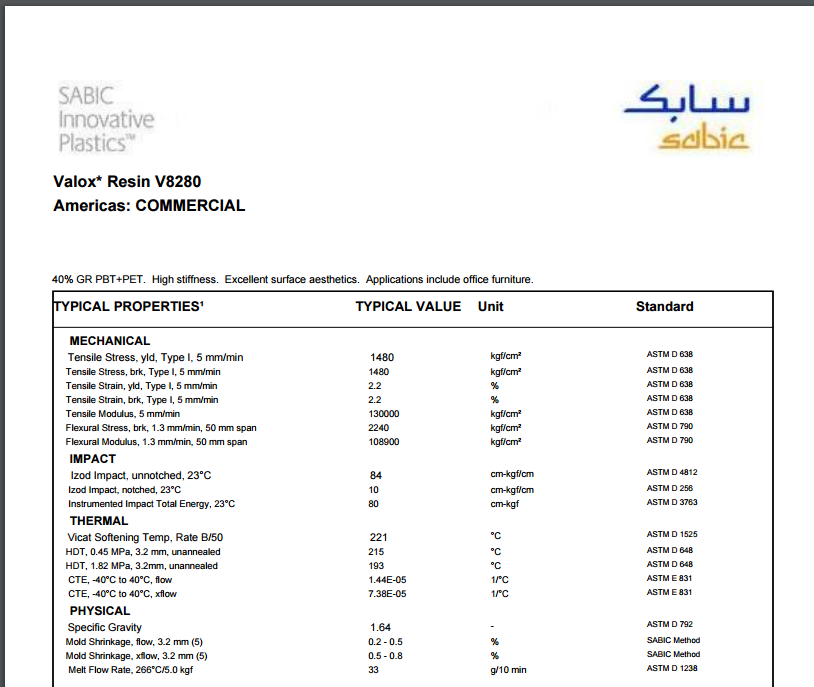 Valox PBT VIC4311 30%玻璃填充,影响改性PBT具有优良的环氧树脂粘合。如点火线圈外壳,汽车引擎盖下的应用