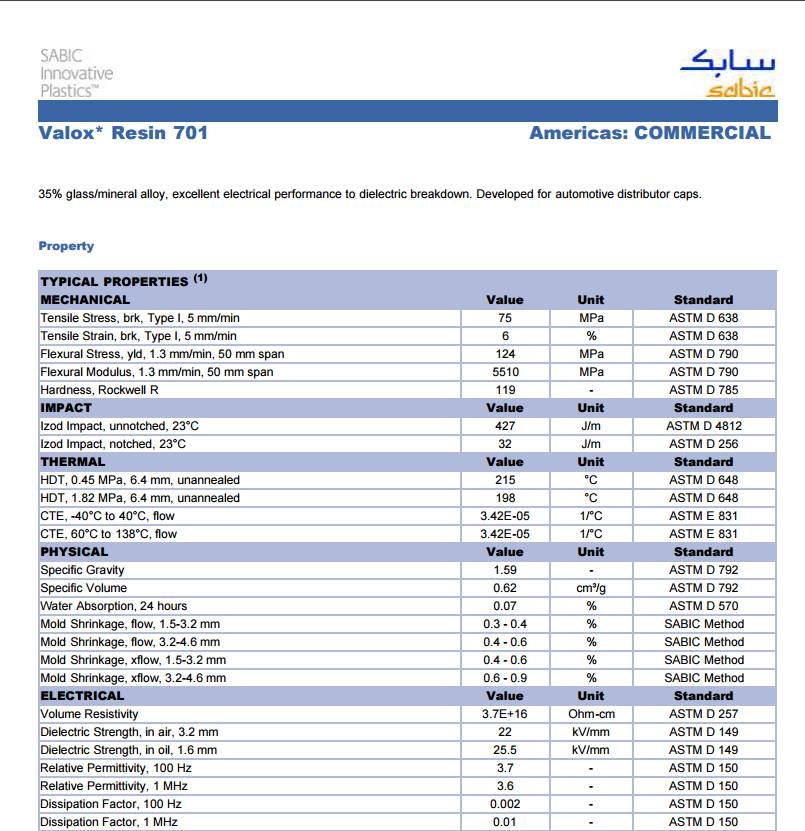 Valox PBT 701 35% 玻纤/矿物合金化聚合物。对介电击穿有优异的电气性能。用于汽车分电器盖。