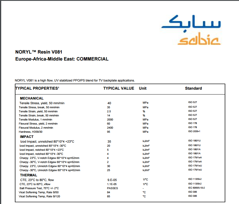 Noryl PPO V081 一个高流动,UV稳定的PPO/PS共混 电视背板应用