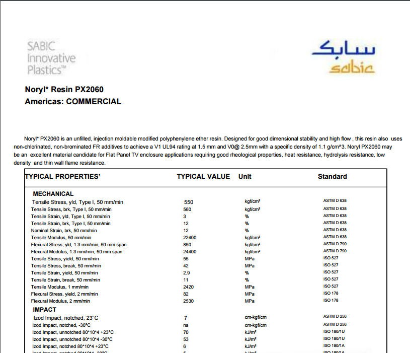 Noryl PPO PX2060 注射成型的改性聚苯醚树脂。专为良好的尺寸稳定性和高流动性