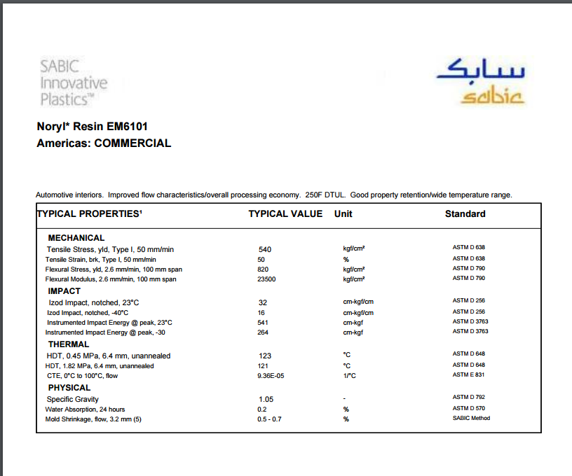 Noryl PPO EM6101 制造汽车内部件。改良的流动性、整体加工经济性。DTUL(载荷挠曲温度):250F。良好的性能稳定性,温度适用范围广