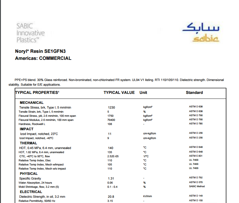 Noryl PPO SE1GFN3 30% 玻纤增强。DTUL(载荷下挠曲温度):275F (135C)。 UL94 V-1 额定。无卤阻燃。电力建设。