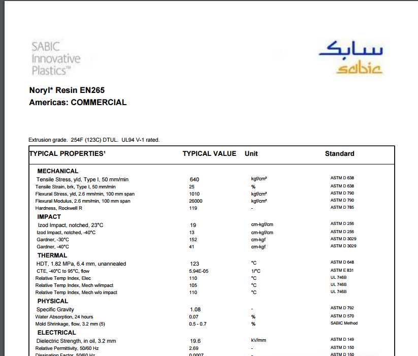 Noryl PPO EN265 挤塑级。DTUL(载荷下挠曲温度):254F (123C) UL94 V-1 额定值。