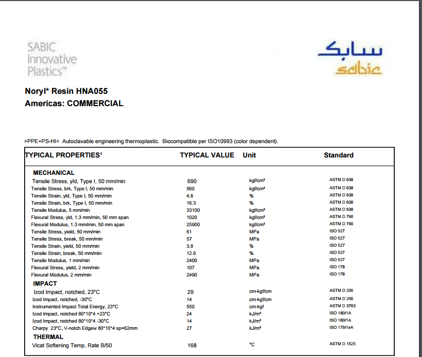 Noryl PPO HNA055 PPE+PS-HI 耐高压的热塑性工程塑料。生物相容性每ISO10993