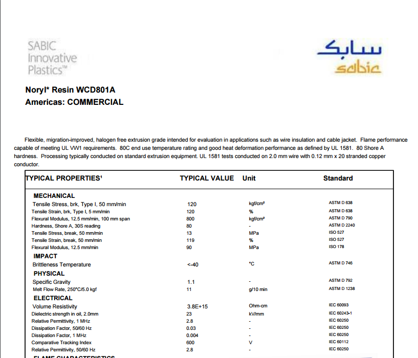 Noryl PPO WCD801A 柔软,非卤化阻燃PPE-TPE挤出级,低比重,硬度80,导线绝缘材料和外壳应用.
