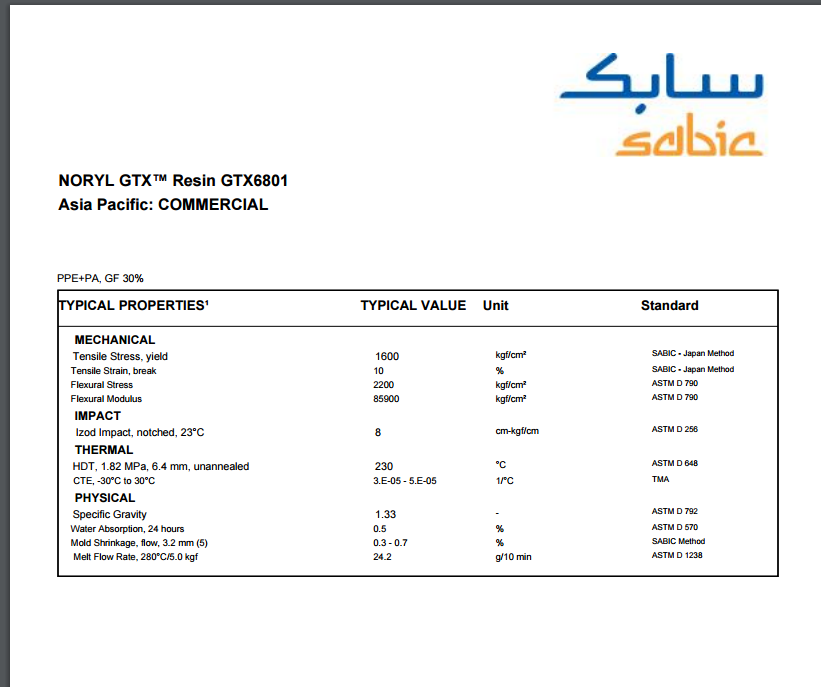 Noryl PPO GTX870 高流动性 / 高耐热性 注塑