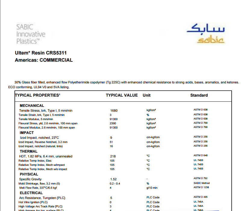 Ultem PEI CRS5311 30% 玻纤增强、低粘度共聚物。改良的耐化学剂性,耐强酸、碱、芳香族环烃、甲酮。