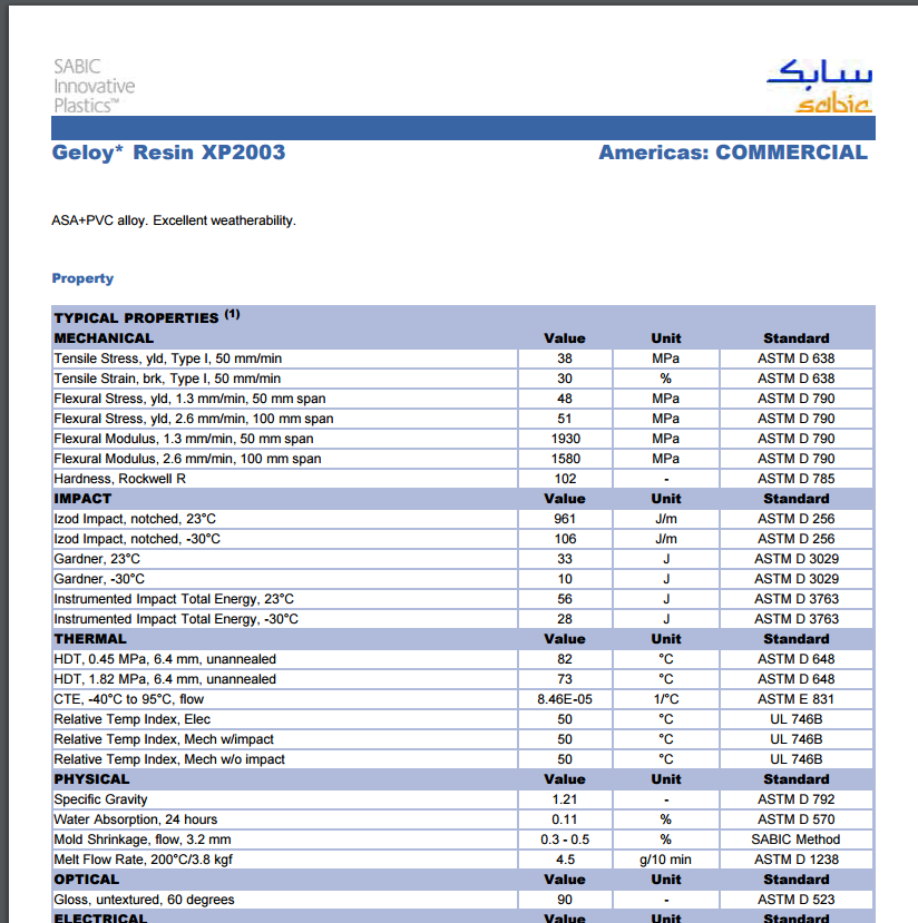 Geloy ASA XP2003 ASA/PVC 合金聚化物。优异的耐天候能力。