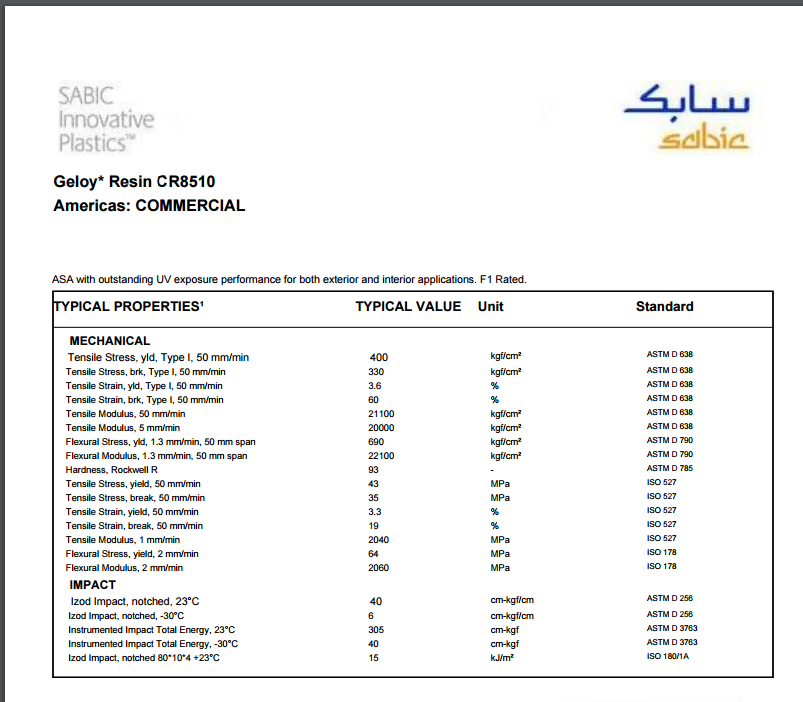 Geloy ASA CR7520 ASA共聚物。 用于汽车格栅、外部件。优异的耐天候能力。良好的流动性、美观、高抗冲击性。