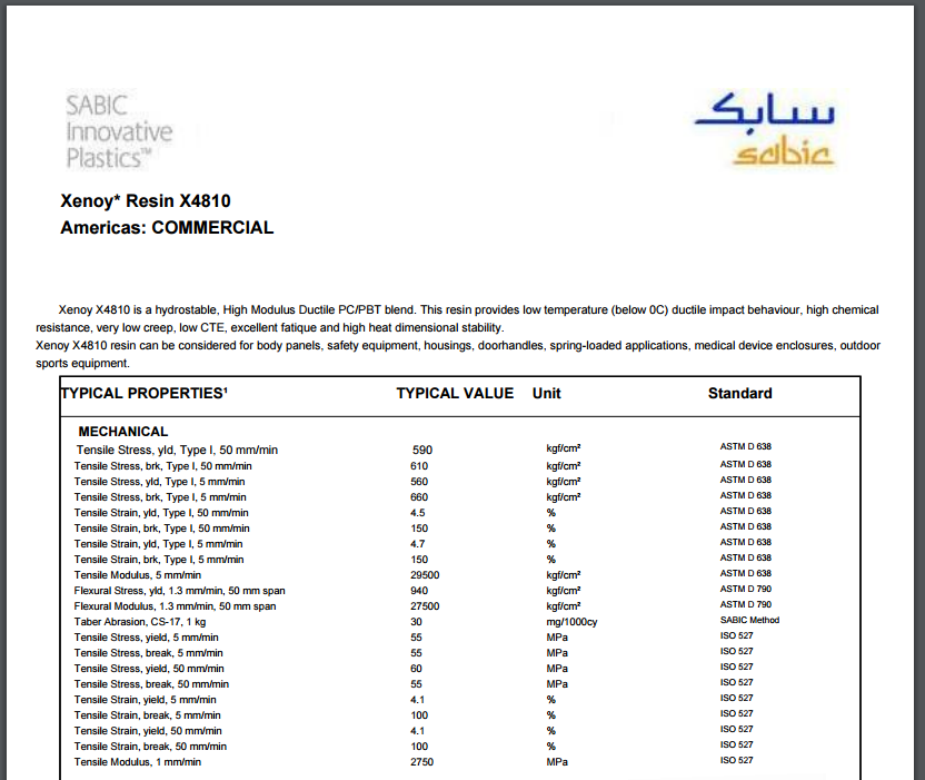 Xenoy PC/PBT X4810 高化学 电阻很低蠕变、热膨胀系数低,优良的疲劳和高温尺寸稳定性。