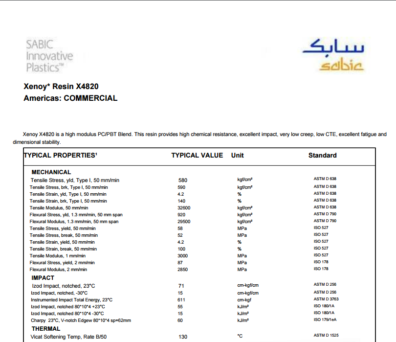 Xenoy PC/PBT X4820 高化学 电阻很低蠕变、热膨胀系数低,优良的疲劳和高温尺寸稳定性。