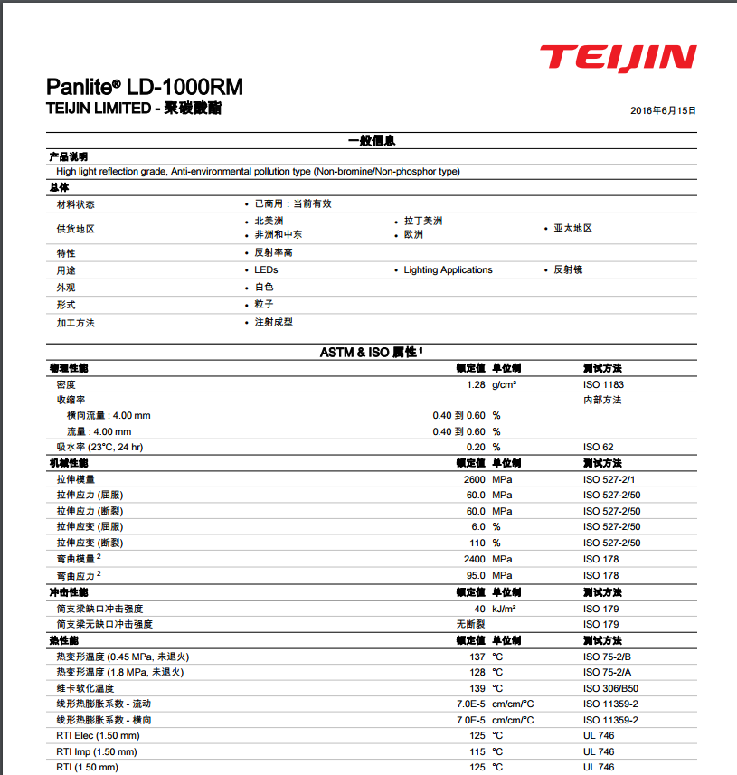 Panlite PC L-1250Z100 耐气候影响性能良好; 脱模性能良好; 中等粘性