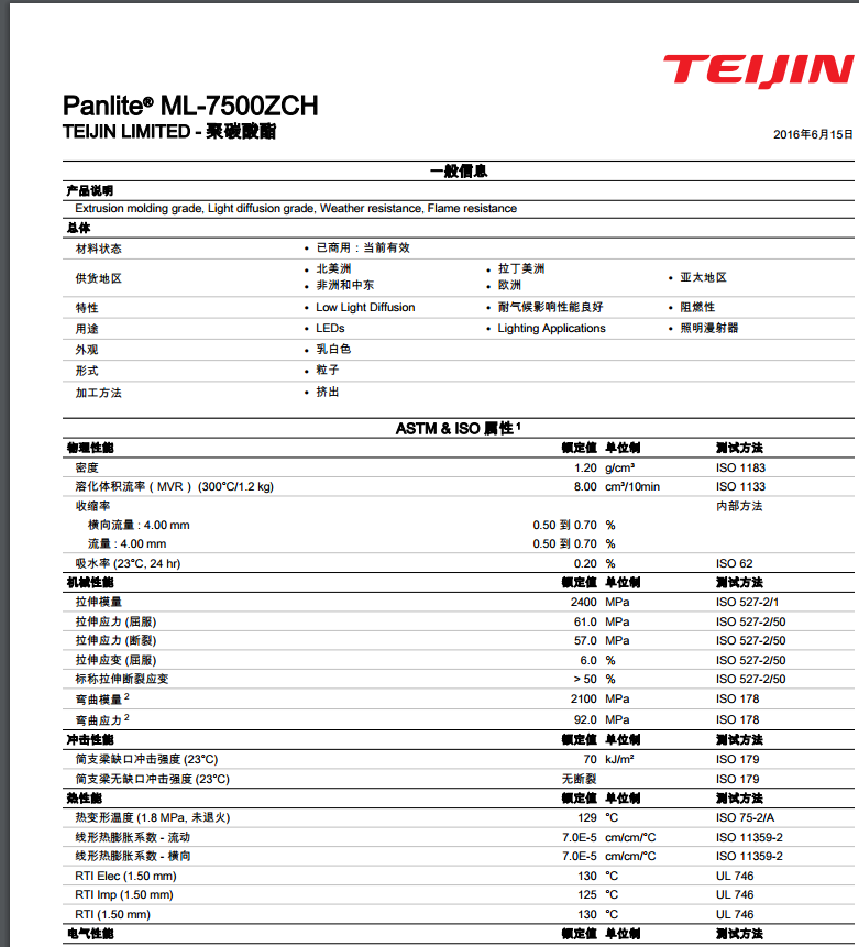 Panlite PC ML-7500ZCL 耐气候影响性能良好; 阻燃性