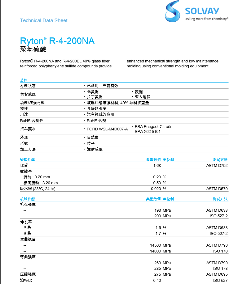 Ryton PPS R-4-200NA 40%玻纤填充 更高的强度和韧性。