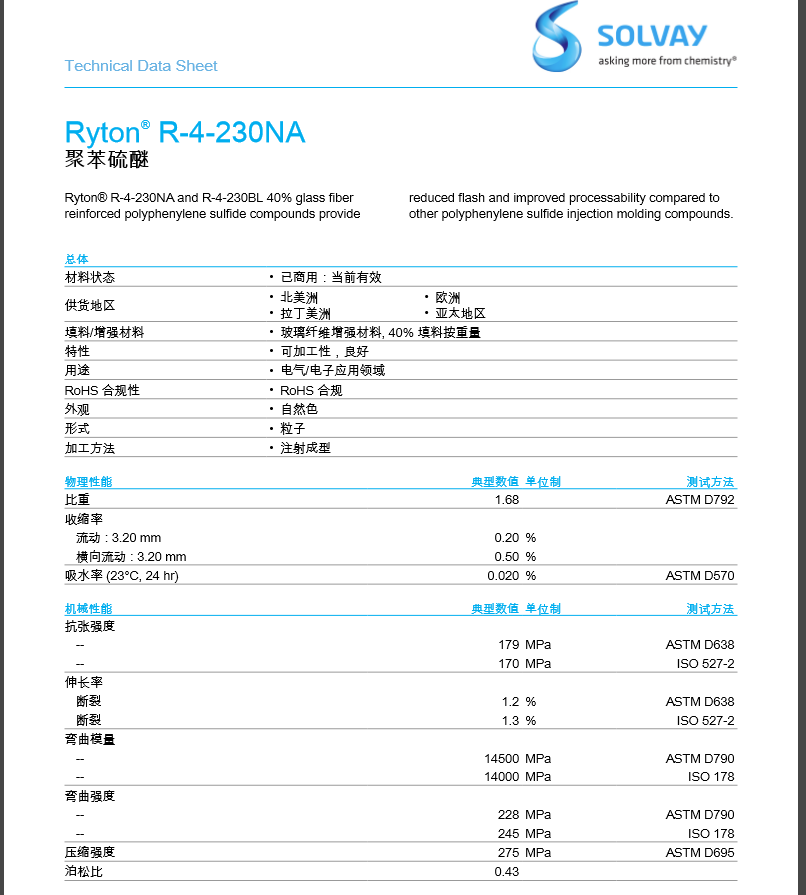 Ryton PPS R-4-230NA 40%玻纤填充 毛边少、流动性好、强度高。