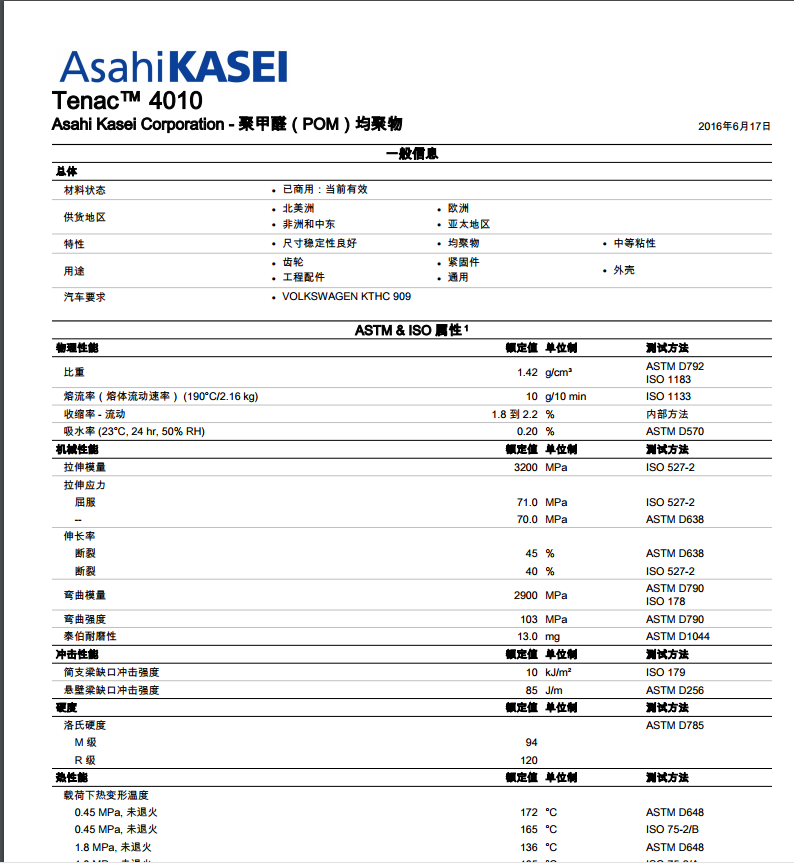 Tenac POM 3013A 尺寸稳定性良好; 刚性,高; 高强度; 均聚物; 抗撞击性,高; 抗紫外线性能良好; 良好的抗蠕变性; 耐疲