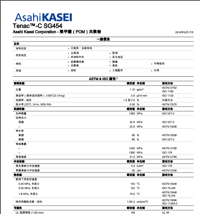 Tenac-C POM SG454 低摩擦系数; 共聚物; 降噪; 柔软; 中等粘性